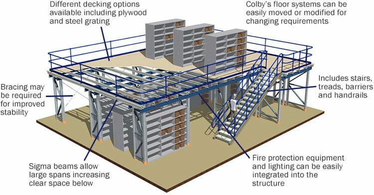 Raised storage areas can be built from Pallet racking components and only attached to the concrete slab floor that it is built on.