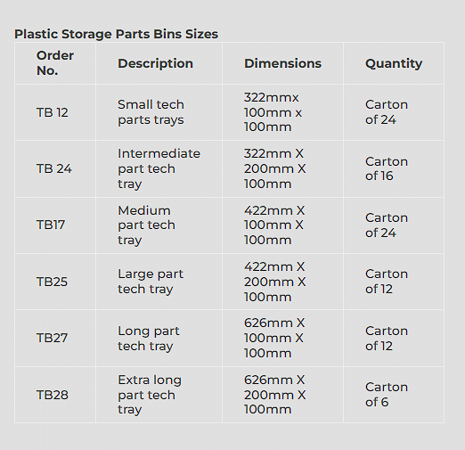 We stock a huge range of plastic parts bins and small parts trays to allow for easy organisation and display of your stock.
