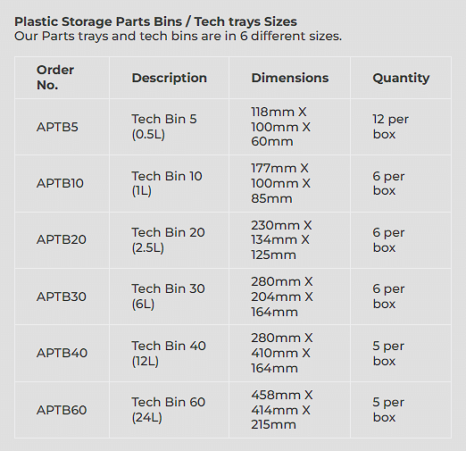 Plastic tech bins are perfect for organising all your small product parts for easy picking and packing. These plastic storage tech trays work together with our Louvred Panels to create a complete Storage System for all your small parts.